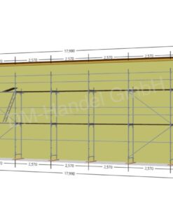 L’échafaudage en acier avec plateformes en acier de 116 m² de surface de travail mesure 17,99 m de largeur et offre une hauteur de travail maximale de 6,4 m.
